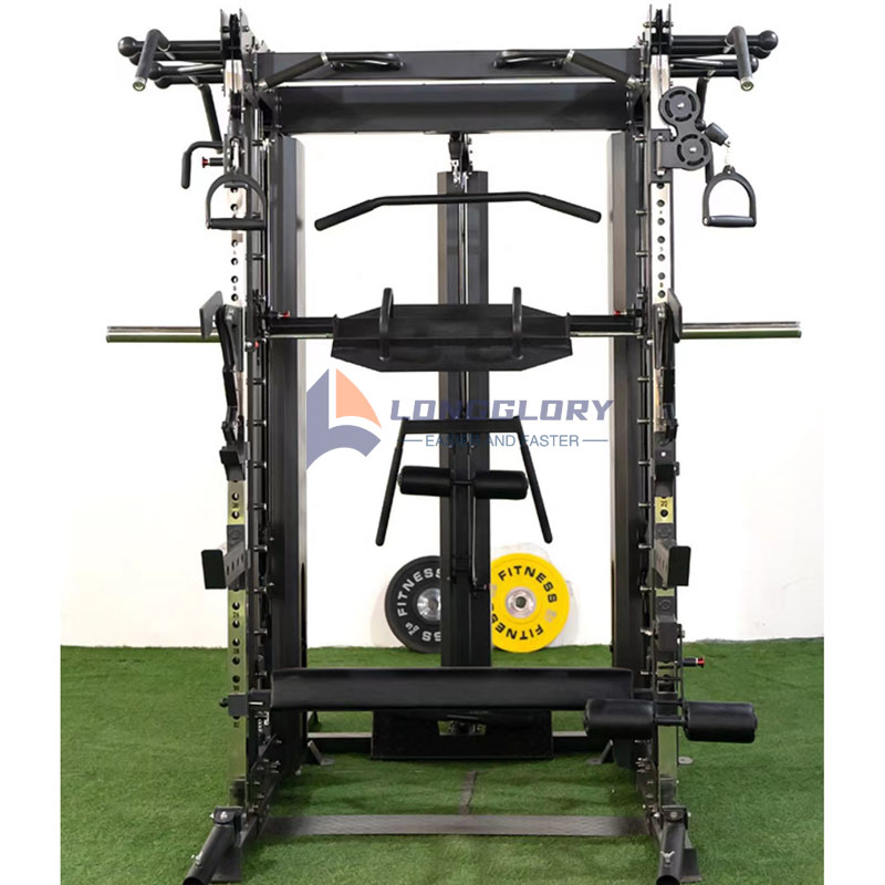 Yhdistelmäkoulutus:Smith -koneMahdollistaa yhdistelmaharjoitukset, kuten takapidennykset ja käsinsuojat. Nämä liikkeet tarjoavat kattavan harjoituksen useille lihasryhmille kehon ympäri.