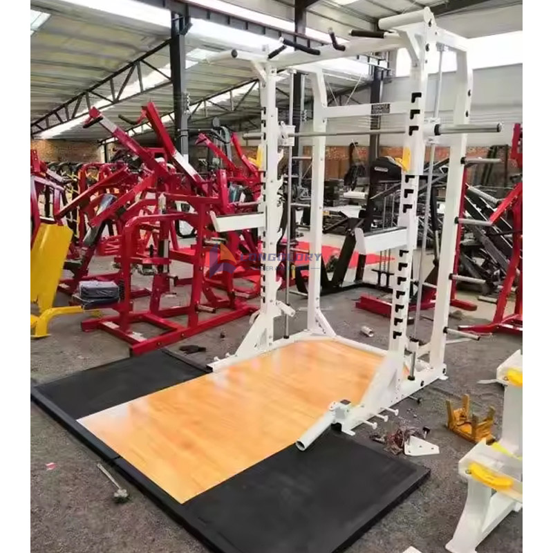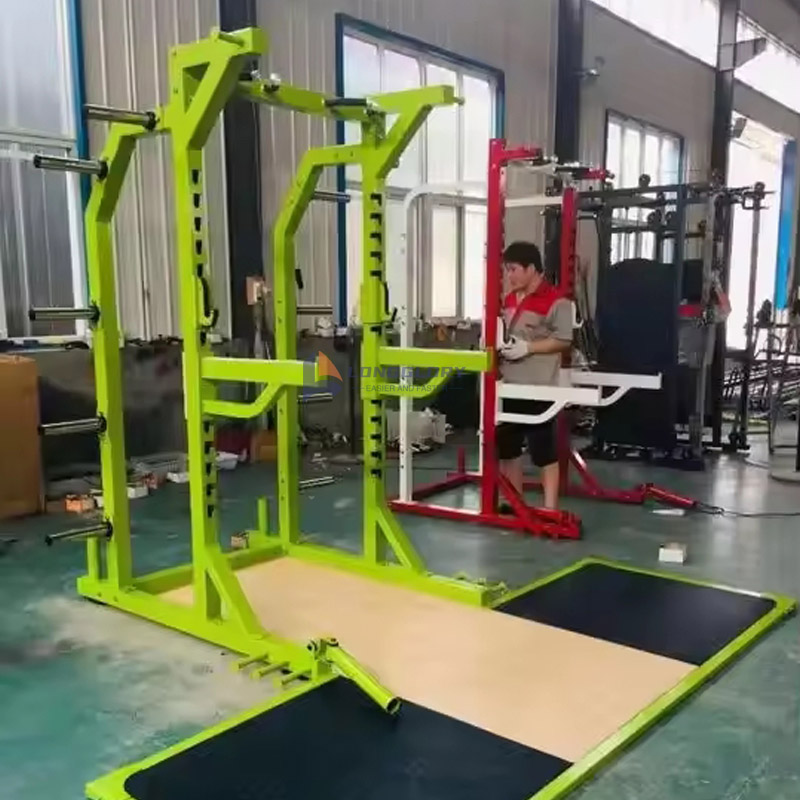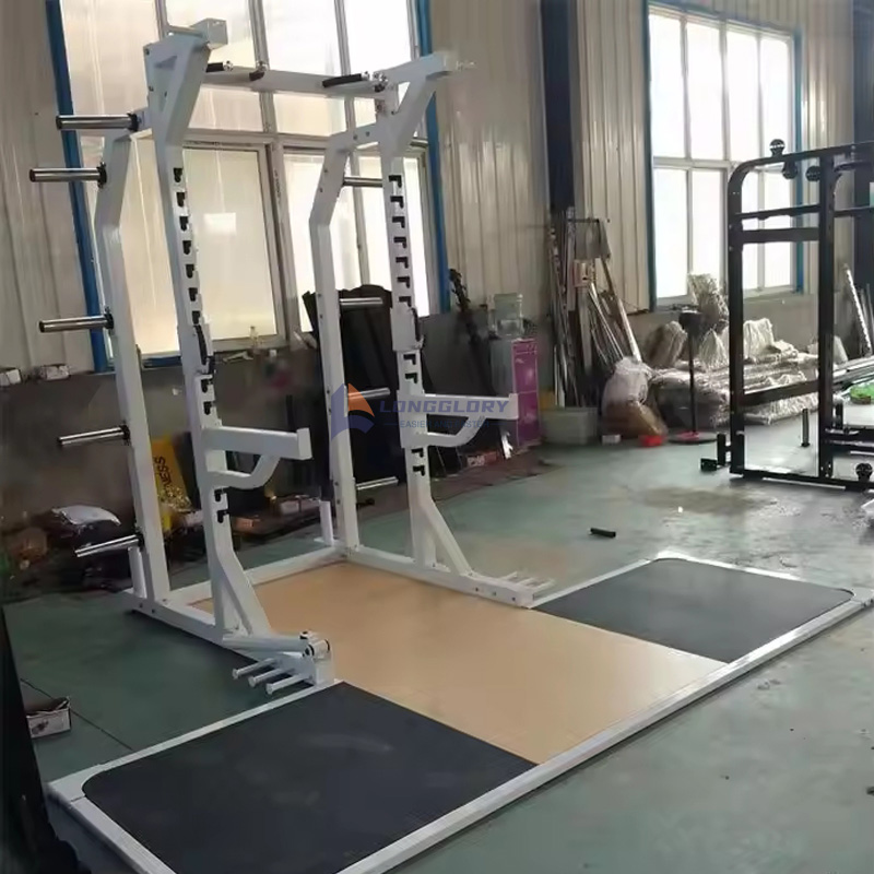 Painonnostotasolla varustettu kyykkyteline on valmistettu korkealaatuisesta Q235-teräksestä, jonka paksuus on 3 mm, ja se sopii korkean intensiteetin käyttöön kuntosalilla. Laitteiden saumat on hitsattu älykkäällä robottivarrella, jolloin hitsit ovat sileitä ja kauniita. Koneen pinta on maalattu kaksikerroksisella sähköstaattisella jauheruiskulla, joka on sileä, korroosionkestävä ja helppo puhdistaa. Pitkä käyttöikä.