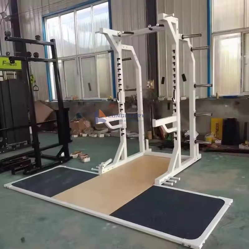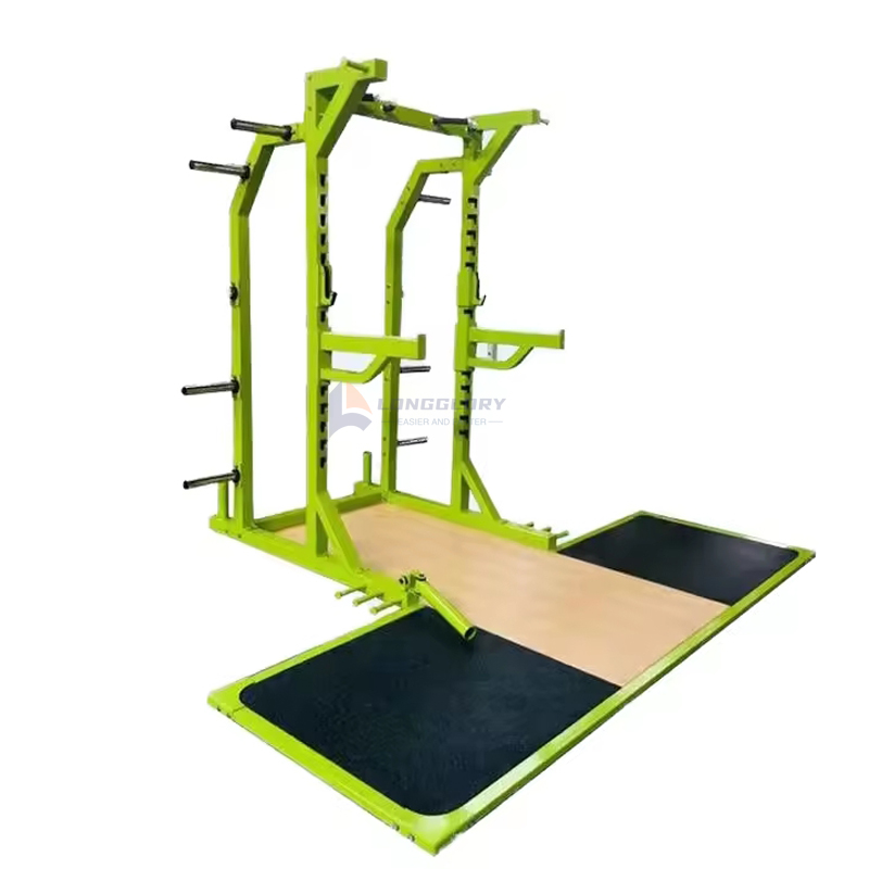 Painonnostotasolla varustetun kyykkytelineen mitat ovat 2800*3100*2400 mm ja sen korkeus on säädettävissä, tämä koko mahdollistaa tangon turvallisen sijoittamisen ja antaa käyttäjälle vakaan tuen turvallisuuden varmistamiseksi harjoituksen aikana, ja säädettävä korkeus mahdollistaa leveän erilaisia harjoittelijoita.